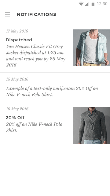 To give prominence to the products in the product listings I used a soft color scheme throughout the app but without compromising readability. The app being in the apparel space I wanted the products to add color to the app. So, I used a white–grey palette with colors limited to indicate selection (check marks and radio buttons) and notifications (badges, error message, etc.).